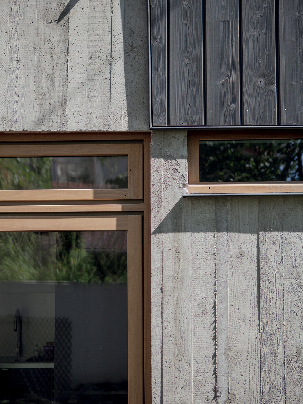 Les deux niveaux s’opposent, sans manichéisme. Alors que le premier est laissé nu ; le second est recouvert d’un bardage protecteur. Mais, marqué par l’empreinte des planches de coffrage, le béton gris cousine avec le bois noir du bardage. Des fenêtres horizontales indiquent le caractère intime de l’étage. Au contraire, la succession des châssis verticaux, qui tous descendent au ras du sol et pour certains coulissent, accorde à la terrasse le rang de pièce à vivre, à l’égal du salon. Ressortant particulièrement sur le gris et le noir, les huisseries et les brise-soleils dessinent sur les façades une trame orthogonale discontinue et plus ou moins serré.
