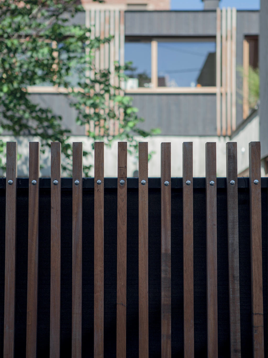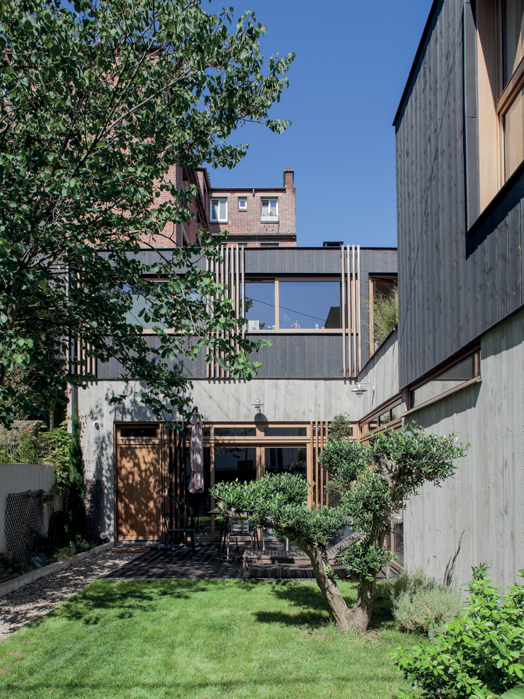 Le jardin est un seuil, ouvert sur la ville, mais il n’est pas le seul espace intermédiaire. Le bout de la maison, au plus près de la rue, abrite le garage. Au-dessus, coupé par le retrait de la terrasse, l’étage semble se détacher. Son parement, qui descend bas, et sa grande baie d’angle, qui regarde aussi bien le jardin que la rue, achève de lui donner un statut différent, un air de retraite perchée. De fait, c’est un bureau, ni tout à fait dedans, ni tout à fait dehors – rêve réalisé du travailleur indépendant contemporain.