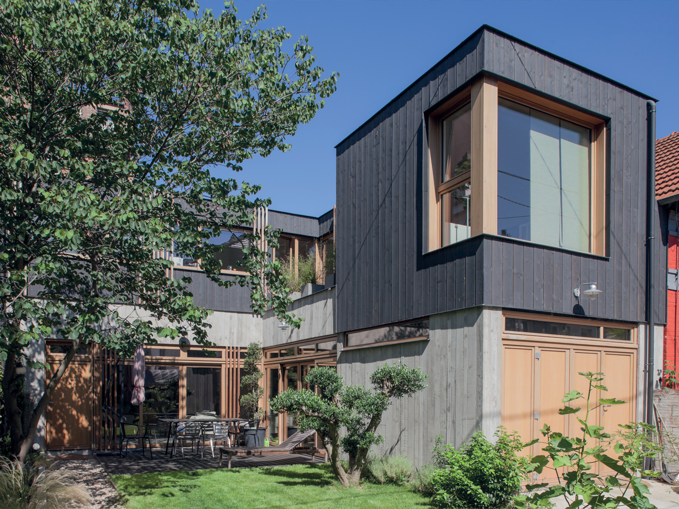 Rompant l’alignement habituel, la maison se retire en limite de parcelle. Elle en occupe deux côtés, libérant un carré de verdure en bordure de rue, protégé derrière une palissade. Avec sa toiture quasi plate, le corps de la bâtisse – deux parallélépipèdes posés à angle droit – offre une silhouette moderne qu’anime une subtile alternance des vides et des pleins, un jeu élaboré de matières et couleurs. La maison y gagne cet air avenant, un peu nippon, qui la singularise.