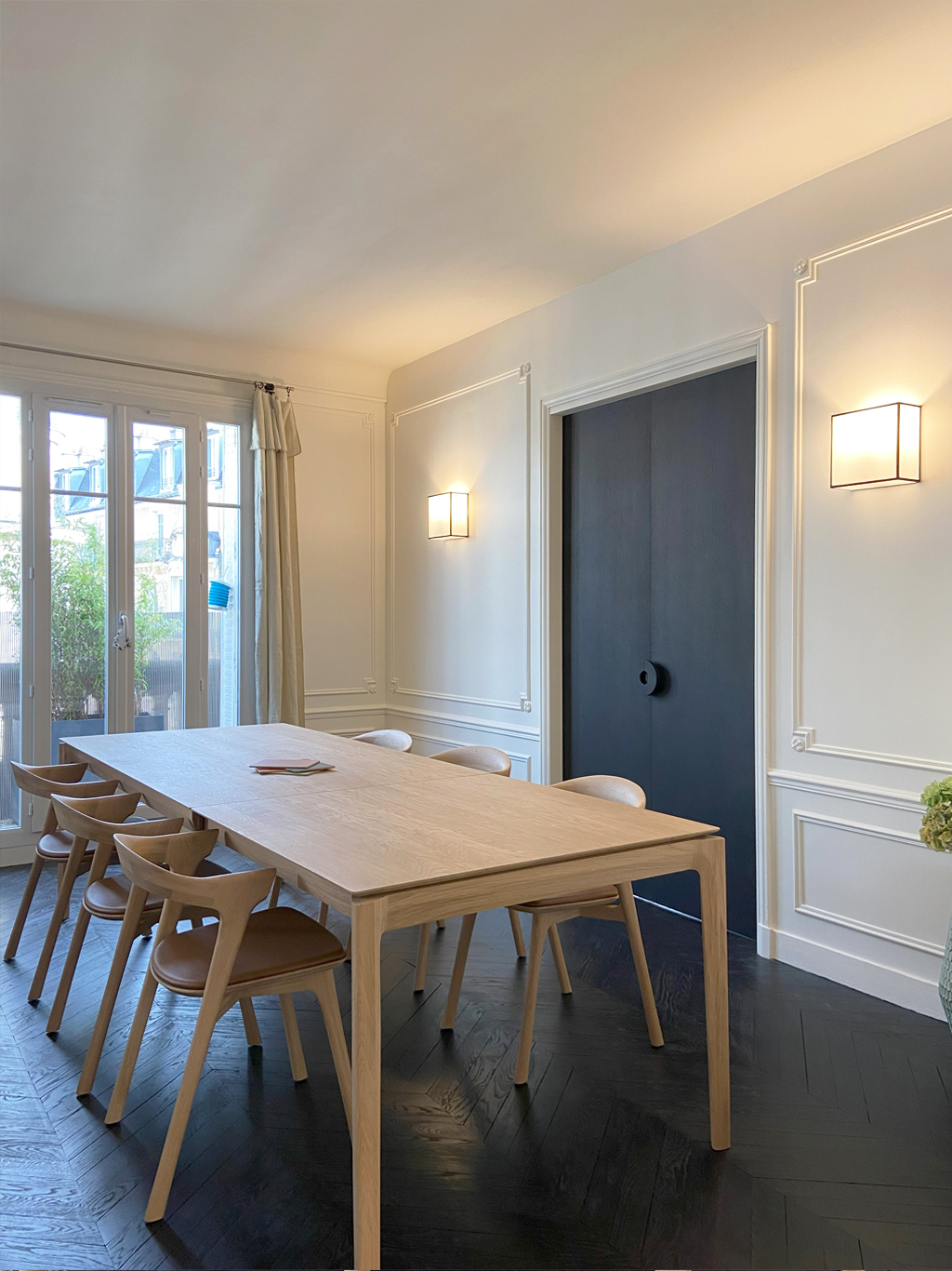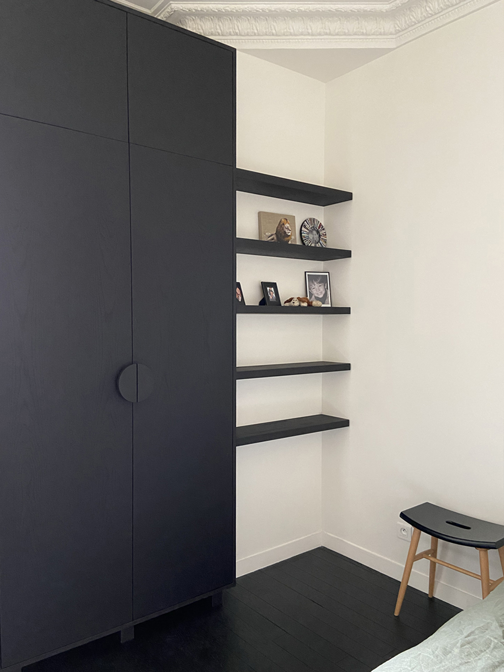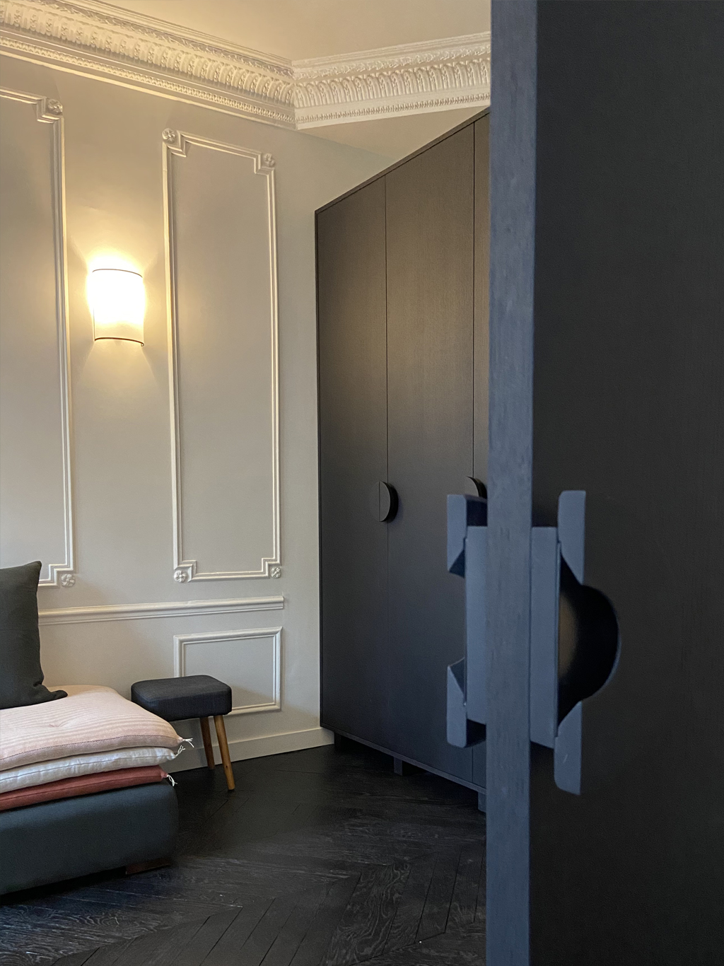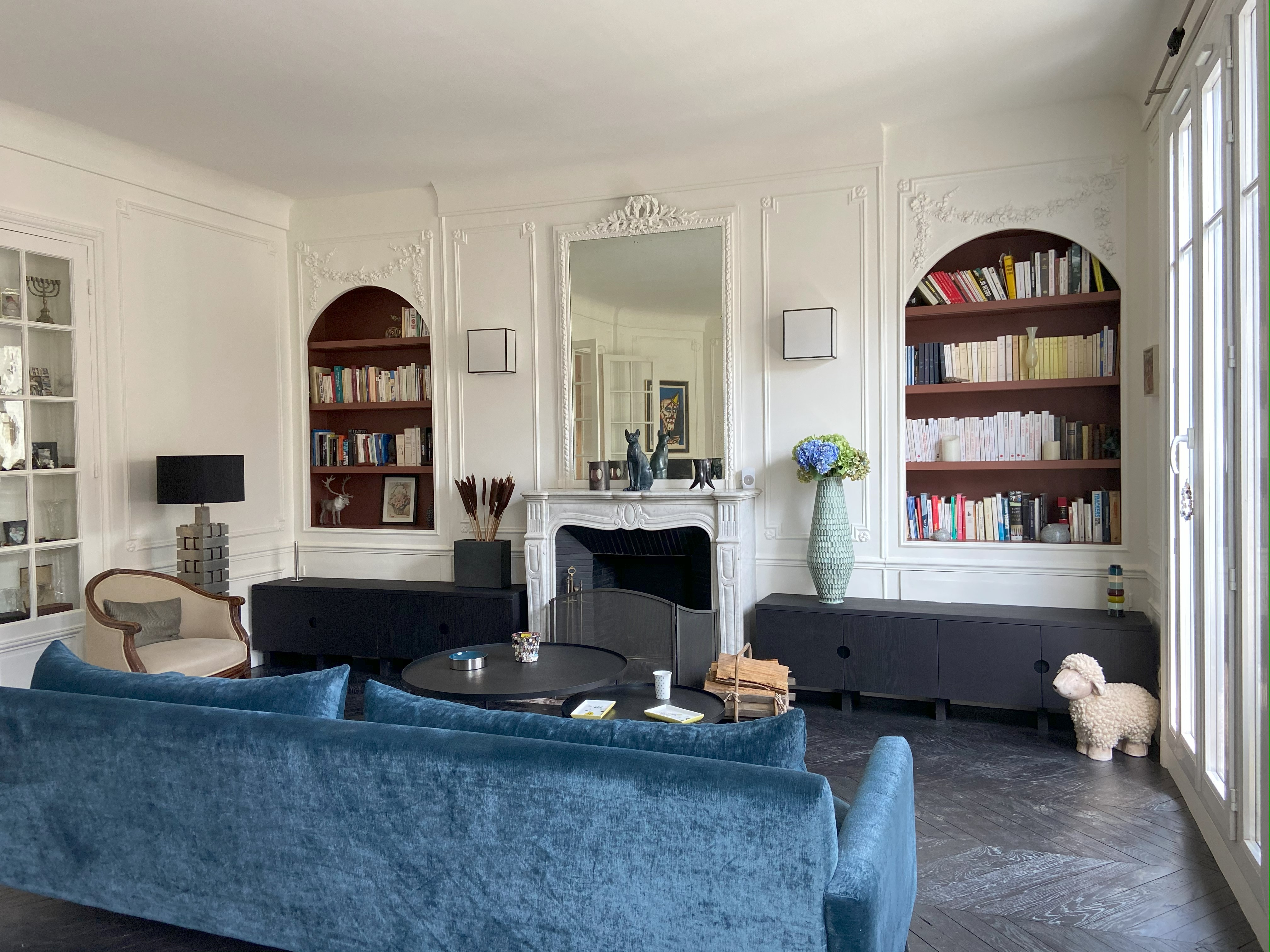 Tout est là, il ne reste qu’à donner une identité, une personnalité à un lieu sans le dénaturer. Conserver les moulures, les cheminées et donner une seconde vie au parquet en point de Hongrie très abimés par le temps. Mettre en valeur un patrimoine existant en jouant de contrastes radicaux.