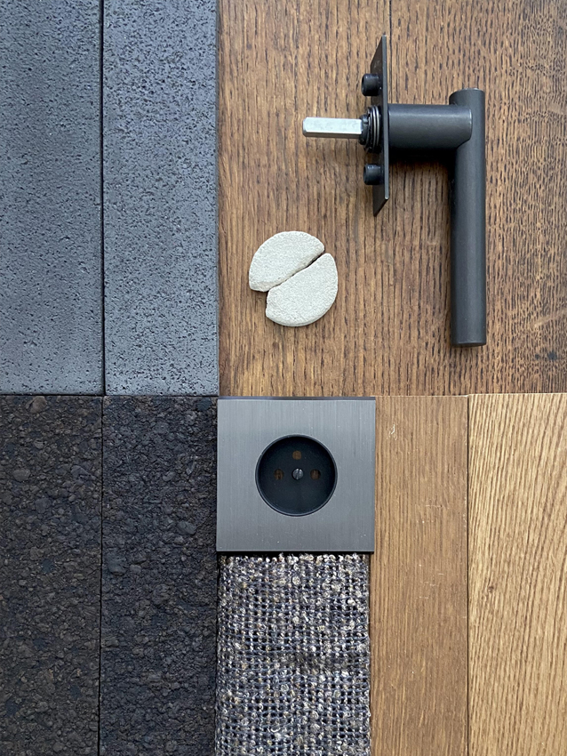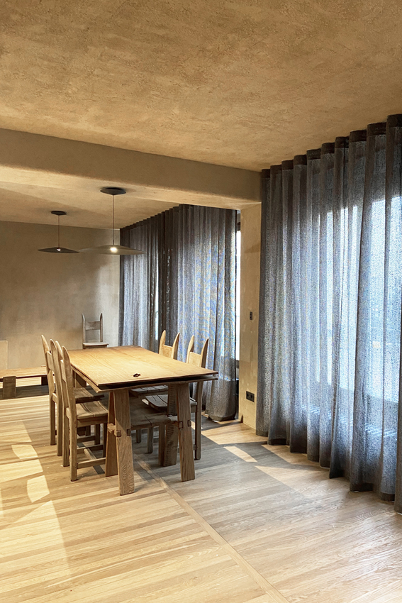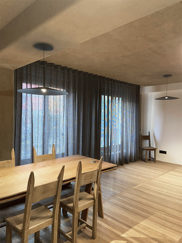 L’espace intérieur a été complètement redéfini en abattant l’intégralité des cloisons afin de créer un espace de travail en open space avec tout le confort d’un espace d’habitation. L’ensemble des murs a été isolé avec des panneaux de chanvre recouverts d’argile naturelle, ce afin de pallier un DPE très défavorable en utilisant des matériaux éco-responsables avec de hautes qualités de performances énergétiques. Les murs en terre, le mobilier sur mesure en chêne massif fumé associés à du mobilier hétéroclite et des objets récoltés aux quatre coins du monde composent ce refuge, cette « grotte », un environnement favorable à la création et à la réflexion.