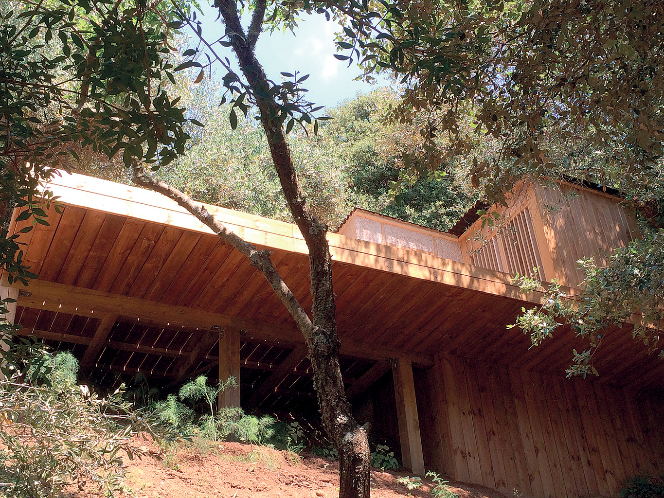 Ils souhaitaient faire l’offrande d’un espace aux amis de passage, pouvoir les gratifier d’une « chambre à eux » : il fallait agrandir la maison. Dans la pente pierreuse, boisée de pins et d’oliviers, on décida d’arrimer un ponton en épargnant les arbres – sous le soleil méridional, se priver de leur ombre aurait été malavisé – pour y poser un cabanon. Réminiscence corbuséenne ? Disons plutôt : le wabi-sabi du maquis, une variation dépaysée du pavillon de thé japonais, clin d’œil à Terunobu Fujimori.