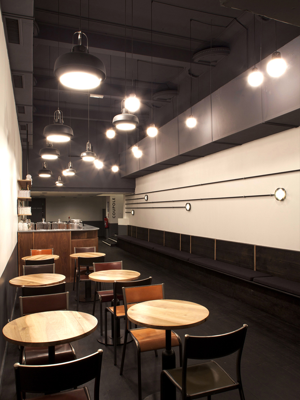 Soumis à l’obligation de ne pas encombrer le passage, l’aménagement poursuit l’étirement expressif. À droite, c’est le couloir. La bande dégagée est simplement bordée d’une banquette filante. Le bistrot est à gauche. Fonctionnel, son mobilier se révèle discrètement précieux. Il décline les tons ambrés – le cuir des chaises, la pierre des guéridons –, en écho à l’élégant comptoir en noyer, vaguement Art déco par ses angles arrondis, qui coupe la salle en deux.