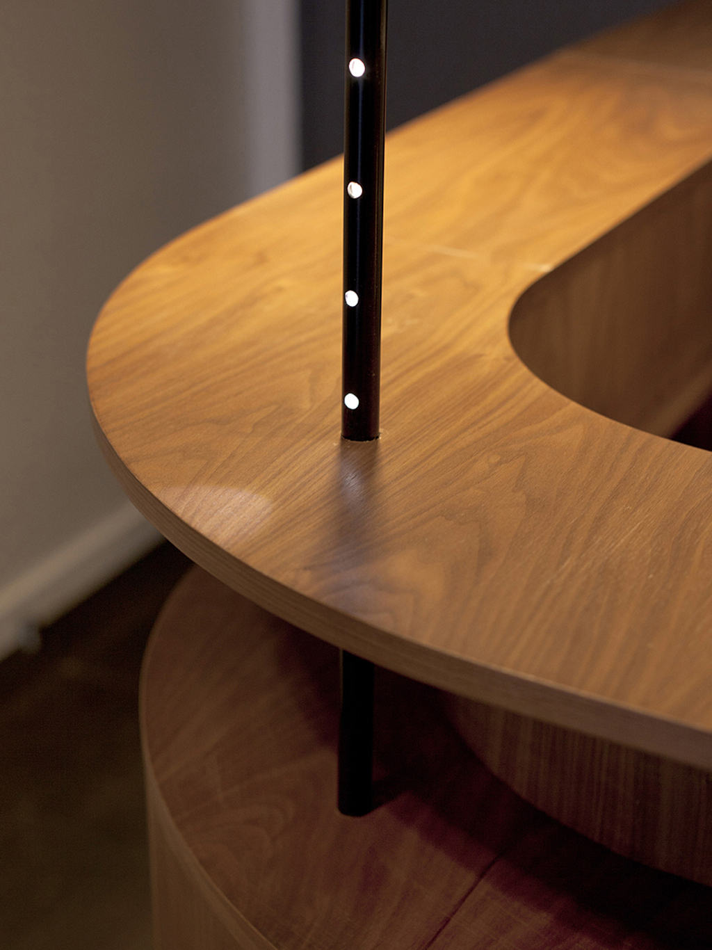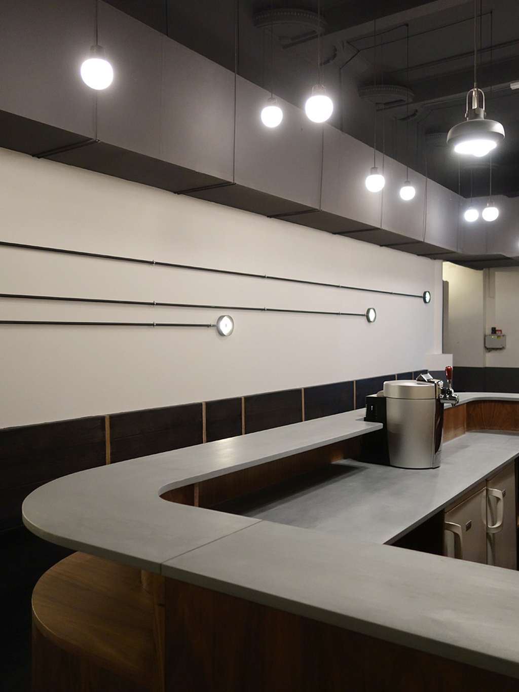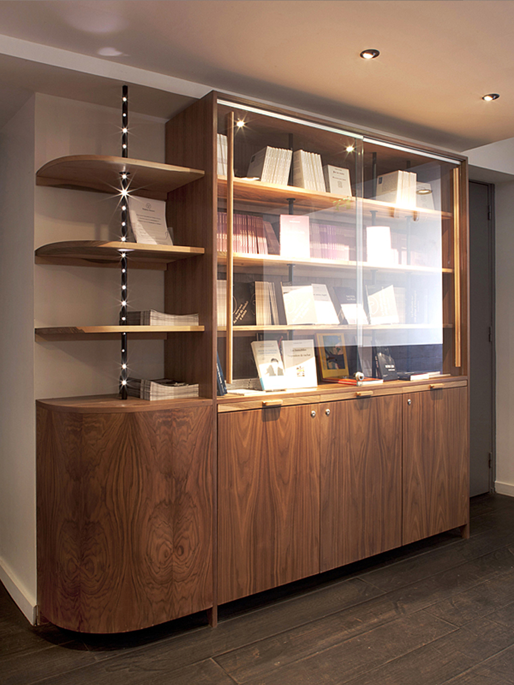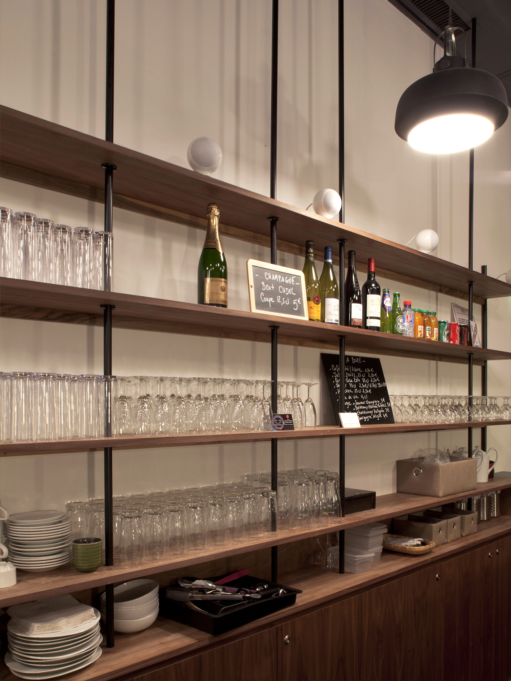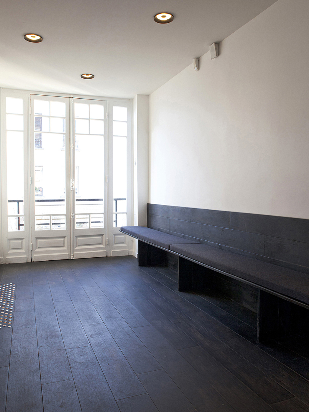 Comment rendre agréable ce lieu plutôt ingrat ? Comment se dépêtrer de tant de mètres cubes ? En les abolissant, sans jamais les cacher, par la magie du noir. Ainsi de la peinture et quelques suspensions donnent-elles l’impression d’un plafond rabaissé. La réciproque est appliquée à la partie inférieure du volume : noir le bas des murs, tout comme le parquet. Entre ces deux masses sombres reste une bande blanche, qui exacerbe l’impression de longueur, soulignant ainsi le caractère circulatoire de l’espace.