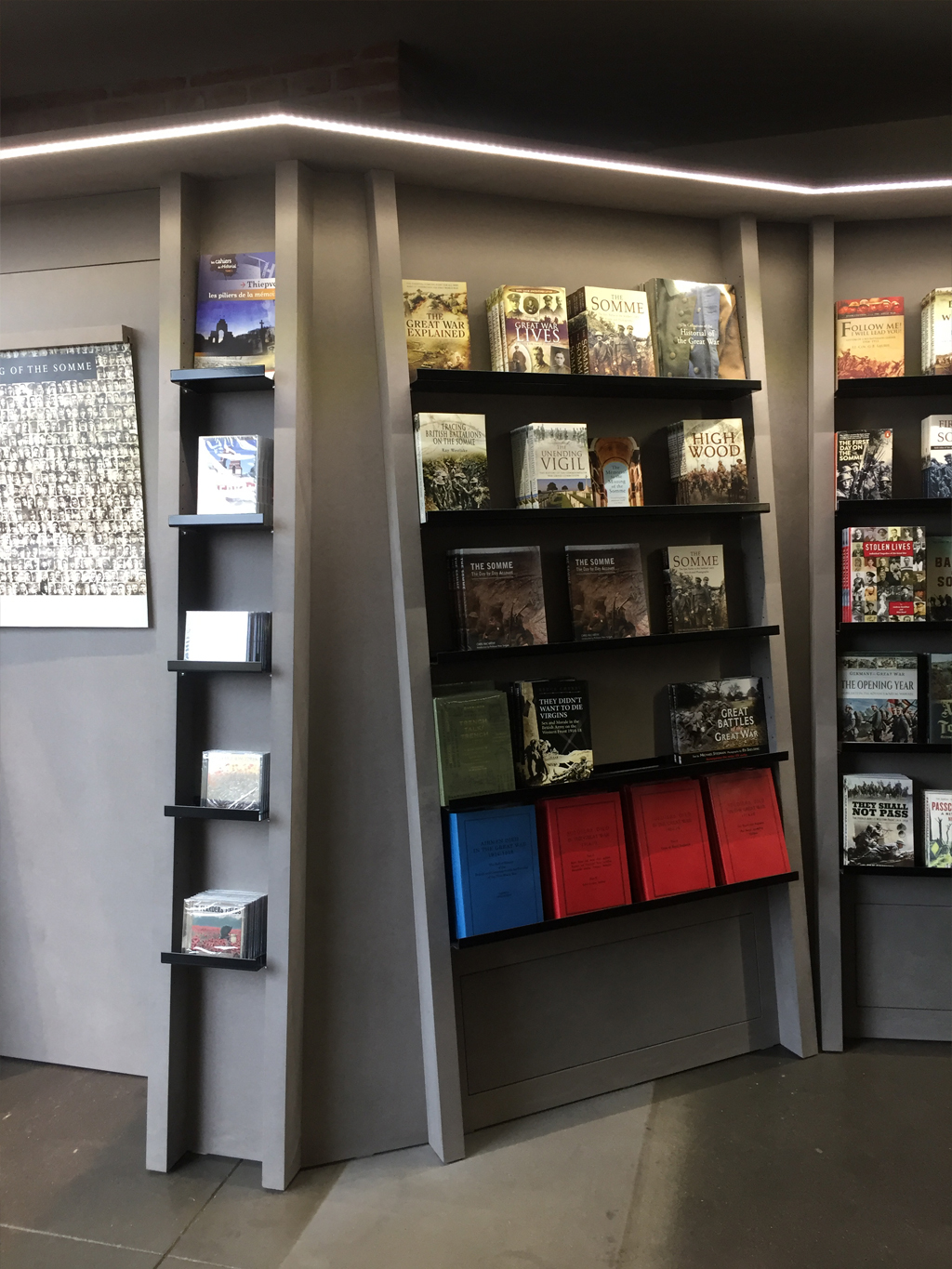 En extension du Centre d’accueil existant, le nouveau Musée a ouvert début juin 2016. Il est consacré à l’histoire des batailles de la Somme, en particulier à celle de 1916, et à la mémoire des soldats disparus. L’espace accueil et boutique a été complètement repensé en 2018 afin de créer une cohérence avec la scénographie du site. L’architecture du mobilier, en Valchromat anthracite, se déploie comme un rempart contrefortant les murs existants du musée. Intervention évocatrice qui tend pour autant à s’effacer pour laisser place à la dureté de l’histoire et d’un site.