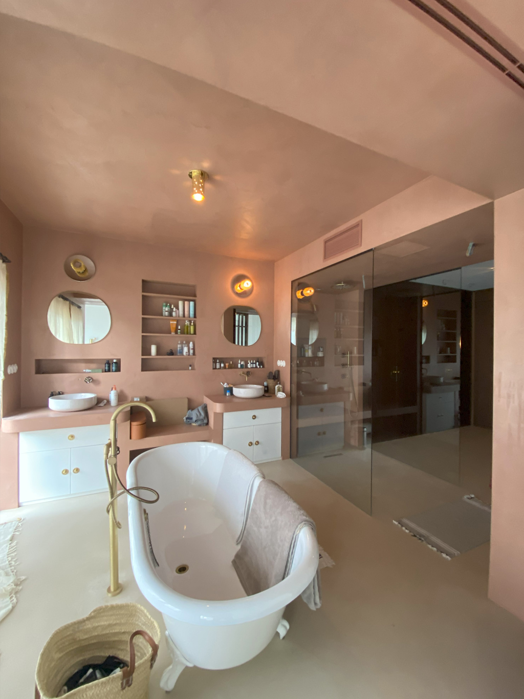 Ces nuances de couleurs se déclinent à travers différents procédés et matériaux tels que la laque, le talochage de minéraux argileux ou encore des papiers peints, des carreaux de terres cuites et du mobilier soigneusement choisi.