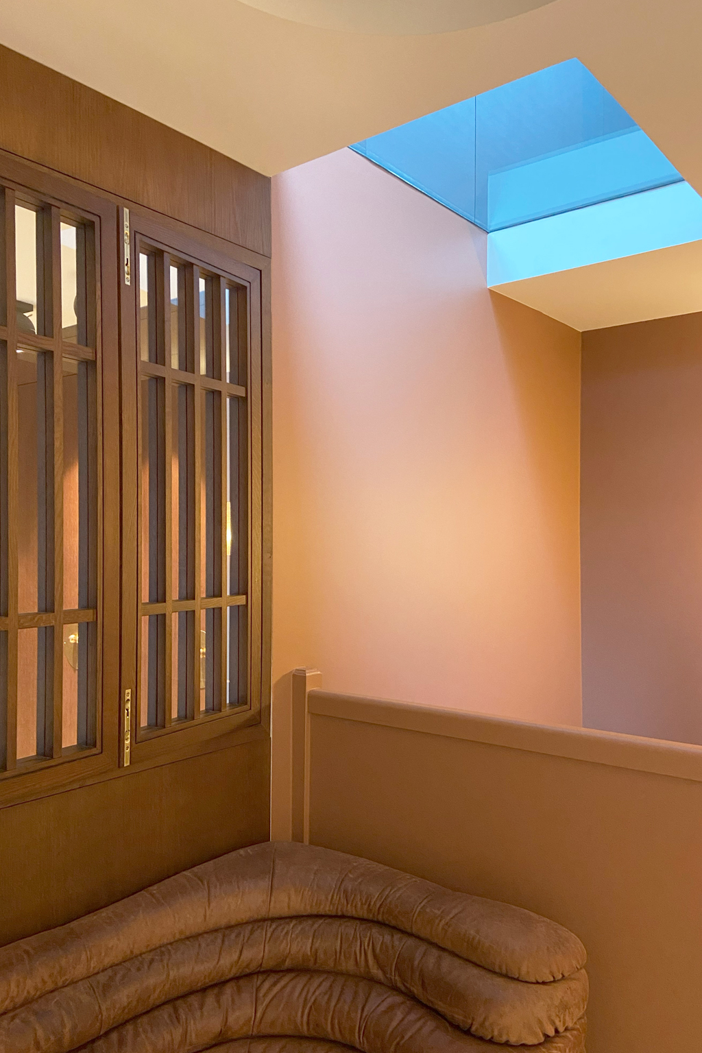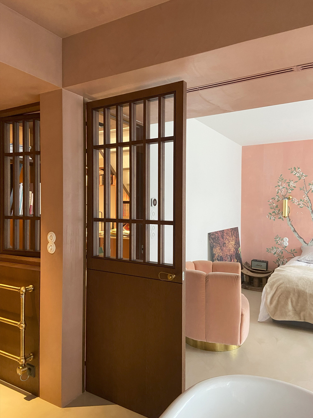 L’espace est rythmé et cadencé par la création de cloisons et d’ouvrants ajourés réalisés en chêne fumé. Jeux de pleins et de vides qui laissent voir sans tout voir, qui filtrent le regard mais aussi la lumière pour que celle-ci flirte discrètement avec les teintes bois de roses qui recouvrent les murs.